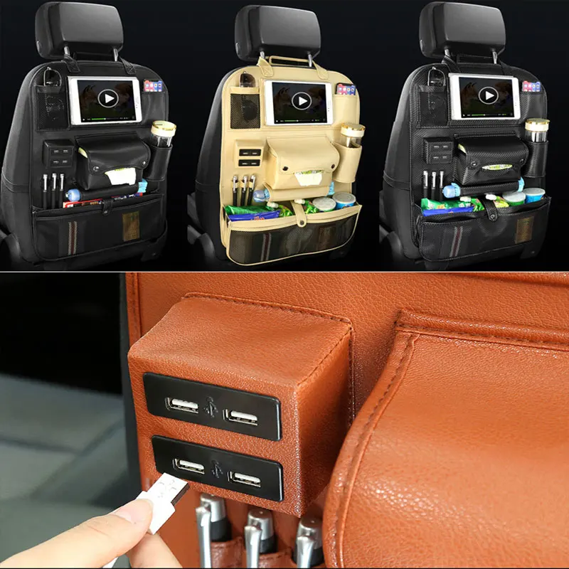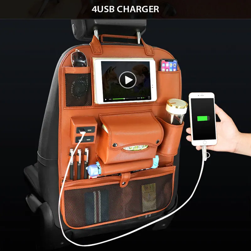 HOT Sale Car Organizer Back Seat Bag 4 USB Charger Phone Storage PU Leather Travel Multifunction Pocket Stow
