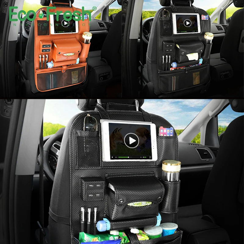 Car Organizer Back Seat Bag 4 USB Charger Phone Storage PU Leather Travel Multifunction Pocket Stow